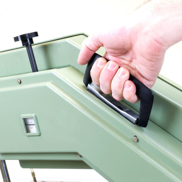 Modern-day fabricators are facing new challenges with increased use of glass mosaics and tile inlay in todays fabrications. The DL5000 helps meet these challenges. The DL5000 cuts through tile, stone, porcelain and glass with ease, speed and comfort - the key is its three-wheel system. The top wheel assembly pivots on a seperate bearing with suppressors controlling its motion. By absorbing more vibration, the saw is capable of extremely effective blade-material contact. With the blade tensioning knob directly connected to the top wheel assembly, accurate adjustments can then be made. This portable band saw is a contactor’s best friend.Features and Benefits